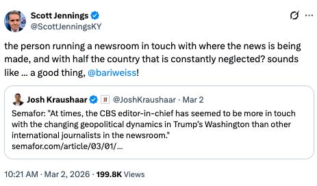 Justin Baragona here, bringing you the latest dispatches from Bari World and the right-wing industrial outrage complex. In tonight’s edition, we take a look at how CBS News is covering the Iran war under the direction of Bari Weiss. Plus, CNN’s resident MAGA defender Scott Jennings is driving his colleagues nuts while kissing up to his future boss; Fox is manufacturing consent for another Middle East war; and Gayle King is going “all in” on Bari.