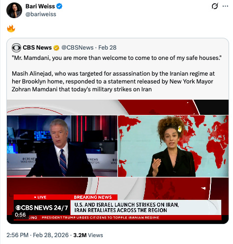 Two network sources told me that Weiss has been very keen on ramping up content that targets the progressive Muslim mayor, leading CBS News reporter Jared Ochacher to film nearly 20 Instagram videos about Mamdani in the past month. Semafor also reported that Weiss had been more engaged with managing coverage of the lead-up to war and Iranian protests than pretty much anything else since she took over CBS News, something my sources confirmed was the case.