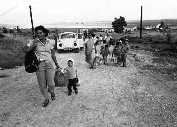 Syrian civilians, hands raised, before Israeli soldiers, leave their homes in the Occupied Syrian Golan. As a result of the mass forcible eviction it is estimated that there are as many as half a million displaced native Syrian Golan exiles currently being denied their right to return by the Israeli authorities.