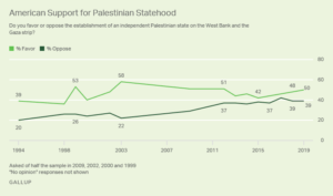 For the first time since 2012, at least half of Americans favor the establishment of an independent Palestinian state “on the West Bank and the Gaza strip.”