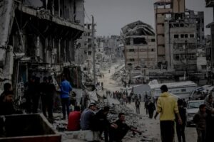Palestinians continue their daily lives among the ruins in the Shuja’iyya neighborhood of Gaza City, on May 12, 2025. (Saeed M. M. T. Jaras – Anadolu Agency)