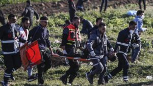 Reporting on Palestine fails to include context. Pictured: a wounded Palestinian is evacuated during a protest at the Israel-Gaza border fence, east of Gaza City on February 22, 2019
